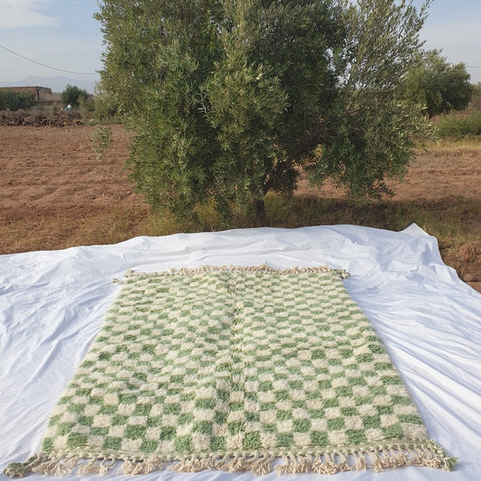 Checkered Rug Beni Ourain Moroccan Green Carpet | 8x5'9 Ft | 2,43x1,80 m | DAMA | 100% wool handmade