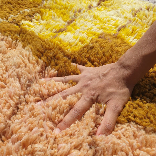 From yellow Moroccan rugs to rainbow lattice designs, our Azilal rugs brighten living rooms or hallways as vibrant Moroccan runner rugs. Each unique piece showcases the weaver’s creativity, perfect for boho-chic spaces. Explore colorful Azilal rugs now.