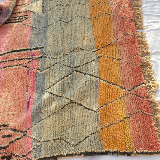 From yellow Moroccan rugs to rainbow lattice designs, our Azilal rugs brighten living rooms or hallways as vibrant Moroccan runner rugs. Each unique piece showcases the weaver’s creativity, perfect for boho-chic spaces. Explore colorful Azilal rugs now.