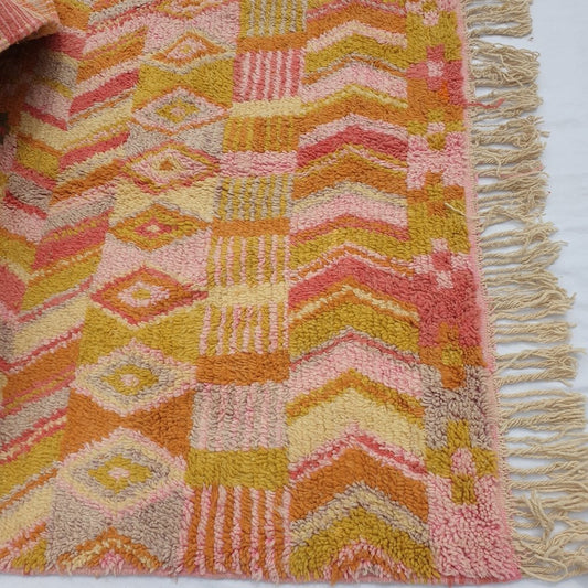 From yellow Moroccan rugs to rainbow lattice designs, our Azilal rugs brighten living rooms or hallways as vibrant Moroccan runner rugs. Each unique piece showcases the weaver’s creativity, perfect for boho-chic spaces. Explore colorful Azilal rugs now.