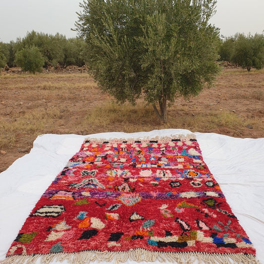 TAPIS BENI OUARAIN Tapis de salon doux et épais rose rouge | Tapis marocain à poils longs en laine berbère authentique | 10'2x6'6 pieds | 3x2 m | Assif