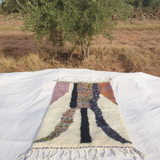 TAPIS BENI OUARAIN Tapis de Chambre Blanc | Tapis marocain à poils longs en laine berbère authentique | 4'9x3'3 Pi | 150x102cm