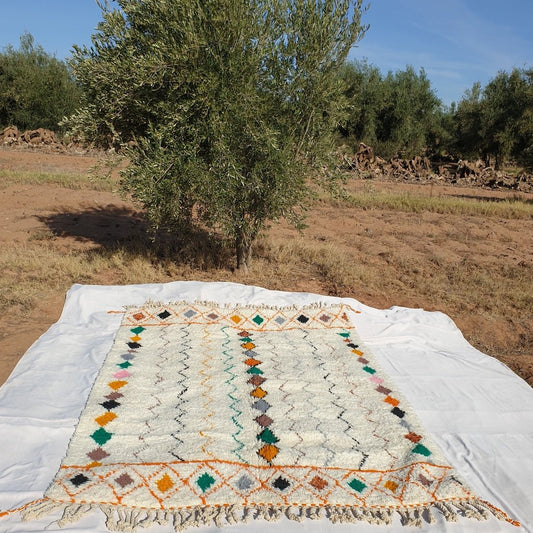 TAPIS BENI OUARAIN Tapis de Chambre Blanc | Tapis marocain à poils longs en laine berbère authentique | 5'1x3'3 Pi | 155x101cm