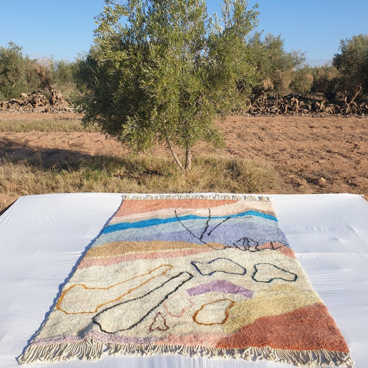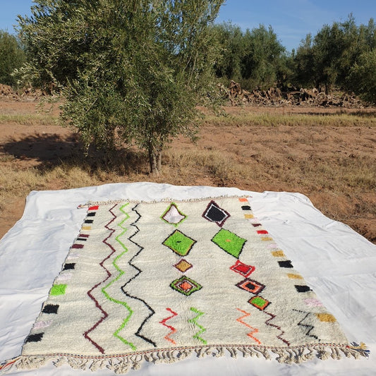 TAPIS BENI OUARAIN Tapis de salon coloré doux et épais | Tapis marocain à poils longs en laine berbère authentique | 10'2x6'8 pieds | 3,10x2,08 m | Birika