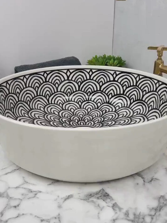 Barcelona - Handmade Moroccan Round Ceramic Sink – Black Feather Pattern Top Counter Vessel Sink - (ETMMT)