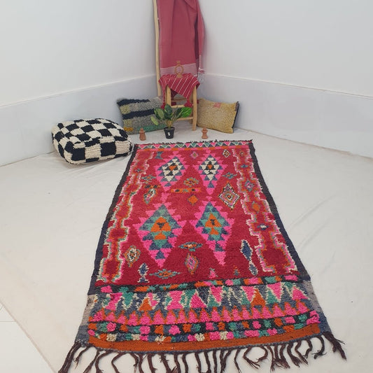 Tapis rouge VINTAGE marocain | 8'7x4' Pi | 2,66x1,23m | BSSIRA | 100% laine fait main