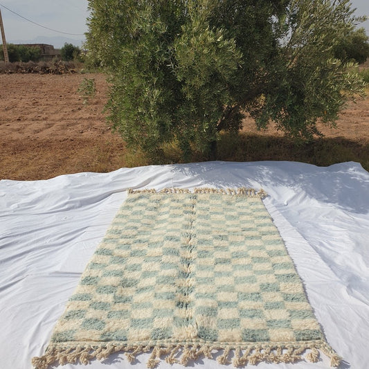Tapis à carreaux Beni Ourain Tapis vert marocain | 8x5'9 pieds | 2,43x1,80 m | DAMA | 100% laine fait main
