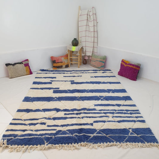 Tapis marocain Beni Ouarain Blanc & Bleu | BAHR | 9'9 x 6'4 pieds | 3x2 m | 100% laine fait main