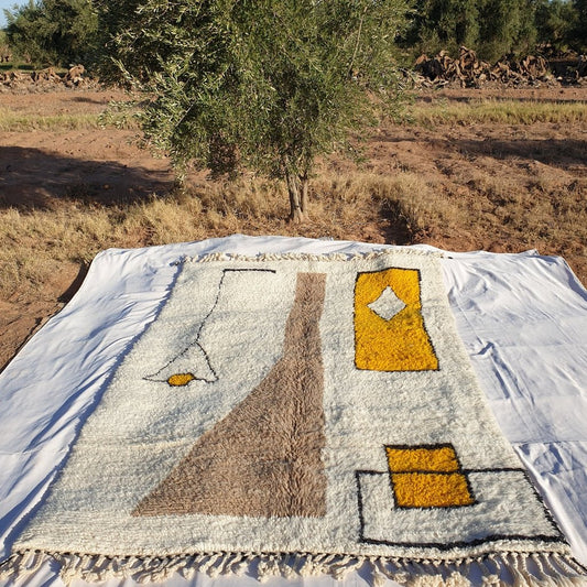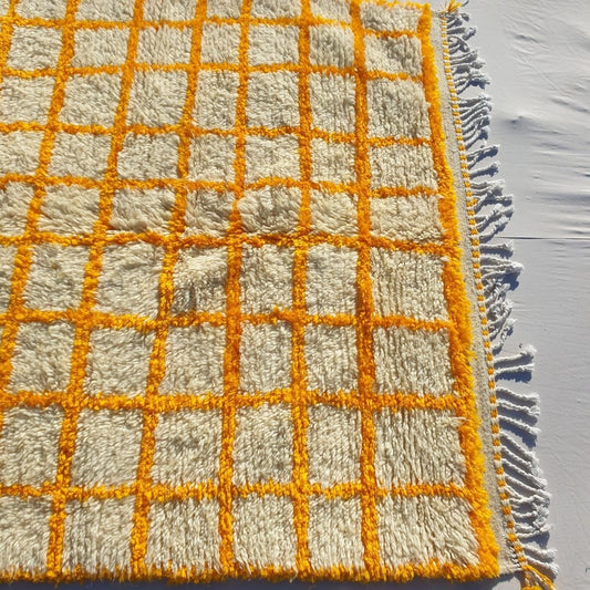 Sfani - Tapis Marocain Blanc Azilal Carreaux Jaunes | Tapis berbère authentique | 8'6x4'8 pi