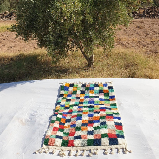 Damia - BENI OUARAIN Tapis à Carreaux Marocain pour Chambre | Tapis marocain à poils longs en laine berbère authentique | 5'6x3'3 pieds | 170x101cm