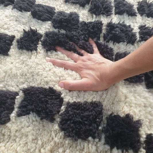 Adwila | Handmade Beni Mrirt Rug 7x10 ft – Plush Black & White Abstract Geometric Moroccan Shag Wool Rug | 7'5"x10'3" Ft | 228x314 cm