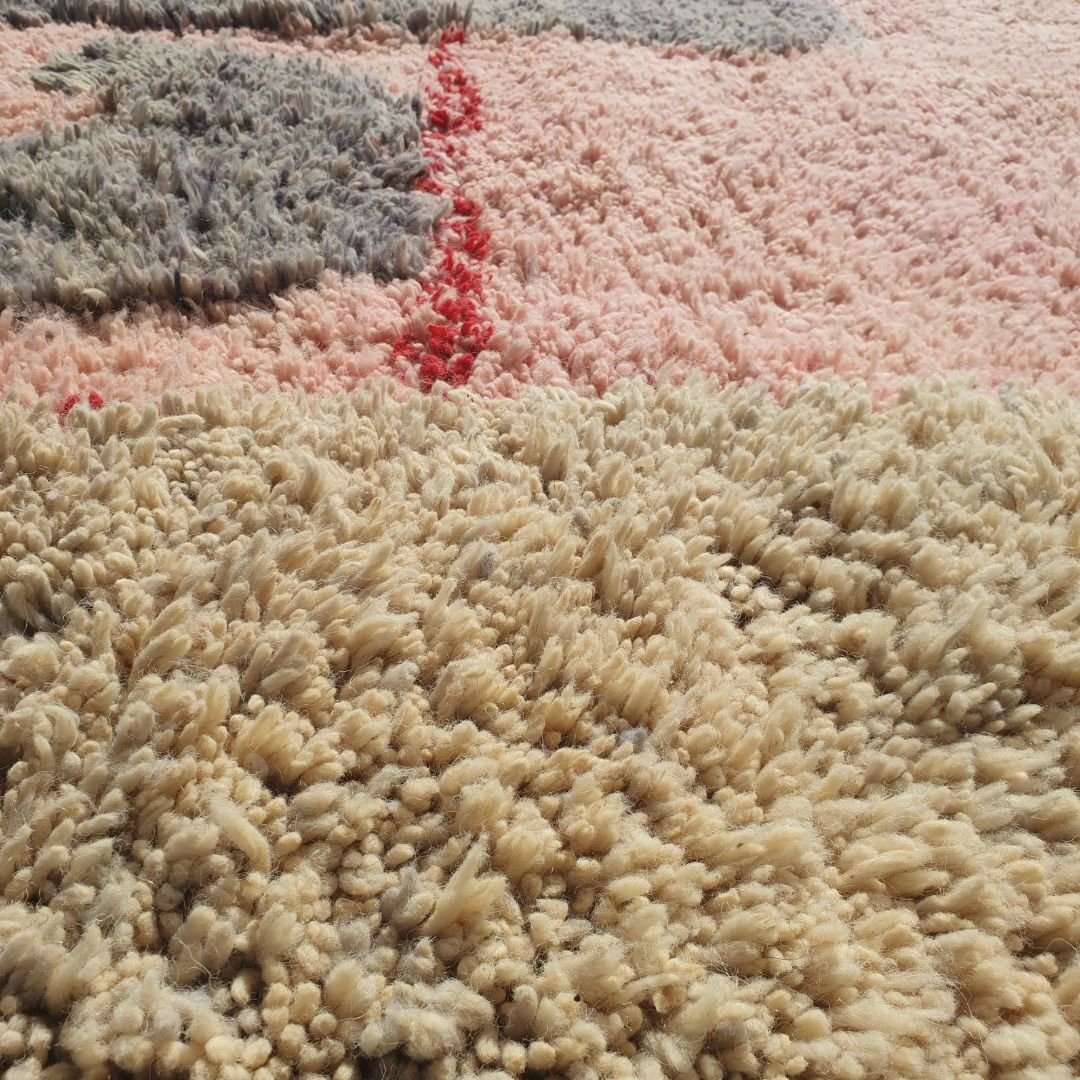 Les femmes berbères emballent la laine sur le métier à tisser vertical en utilisant un peigne en métal, ce qui donne une texture fine et soyeuse de la laine qui vient se sent divinement bien au pied, les tapis Mrirt sont les plus chers en raison de la haute qualité et la quantité de laine que nous utilisons.