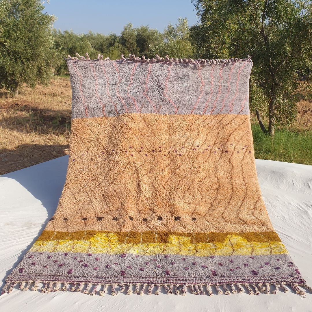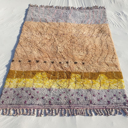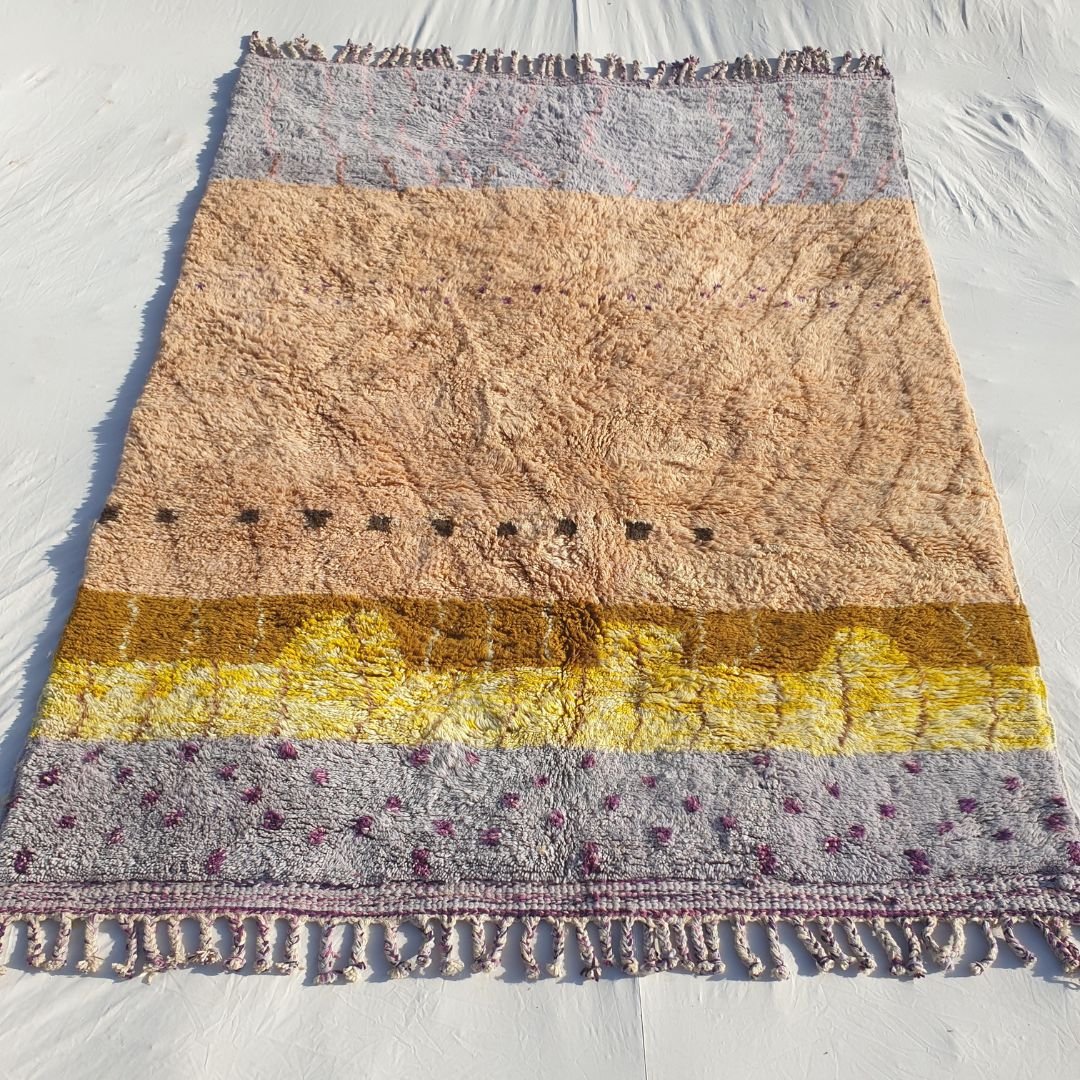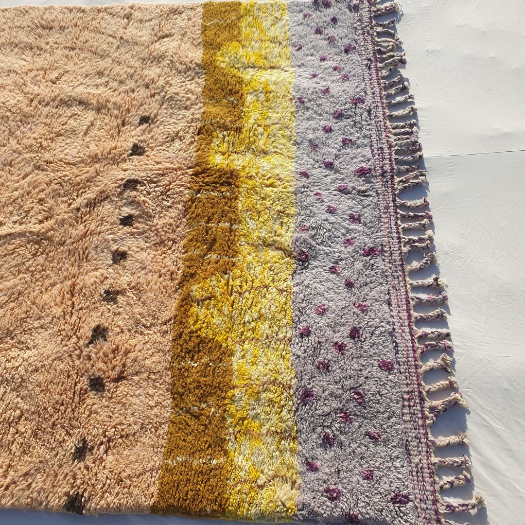 Indulge in the epitome of luxury with the Luxury Dusty Rose Moroccan Rug 6x9, a masterpiece handcrafted by the skilled artisans of the Beni Mrirt region in Morocco’s Middle Atlas Mountains. This handmade Beni Mrirt rug features a lavish blend of dusty rose, yellow, and purple hues, woven from the finest natural dyed wool with an exceptionally thick, shag pile that feels heavenly underfoot. Measuring 6x9 ft (208x287 cm), this 6x9 bedroom rug is a perfect large bedroom rug or 6x9 dining room rug, offering unparalleled softness as a luxury shaggy rug for your master bedroom rug or living room carpet rug.
