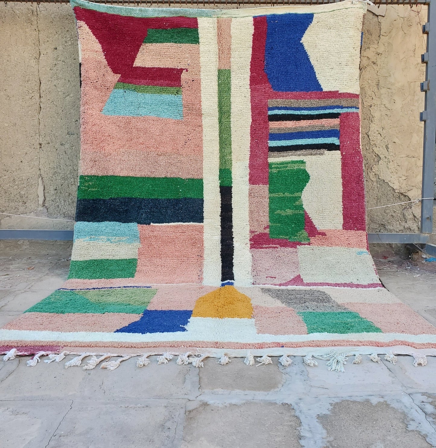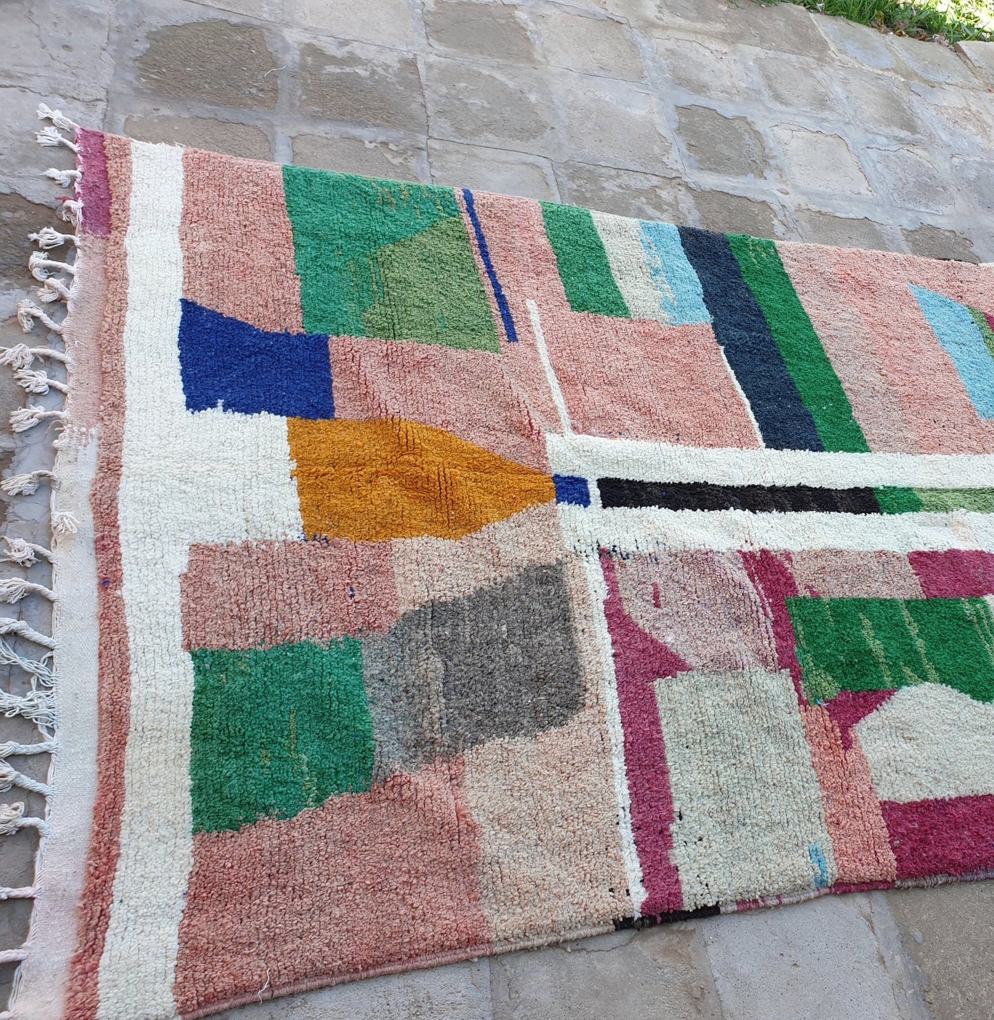 Boujaad, the Amazing Berber lightweight’s rug. The design is Inspired from the Kilim rugs. Named also Hanbal, because of its Boho, Modern, Scandinavian, and traditional Berber Moroccan style, it has only one side, it is usually used for floors or to decorate the walls of the interiors.