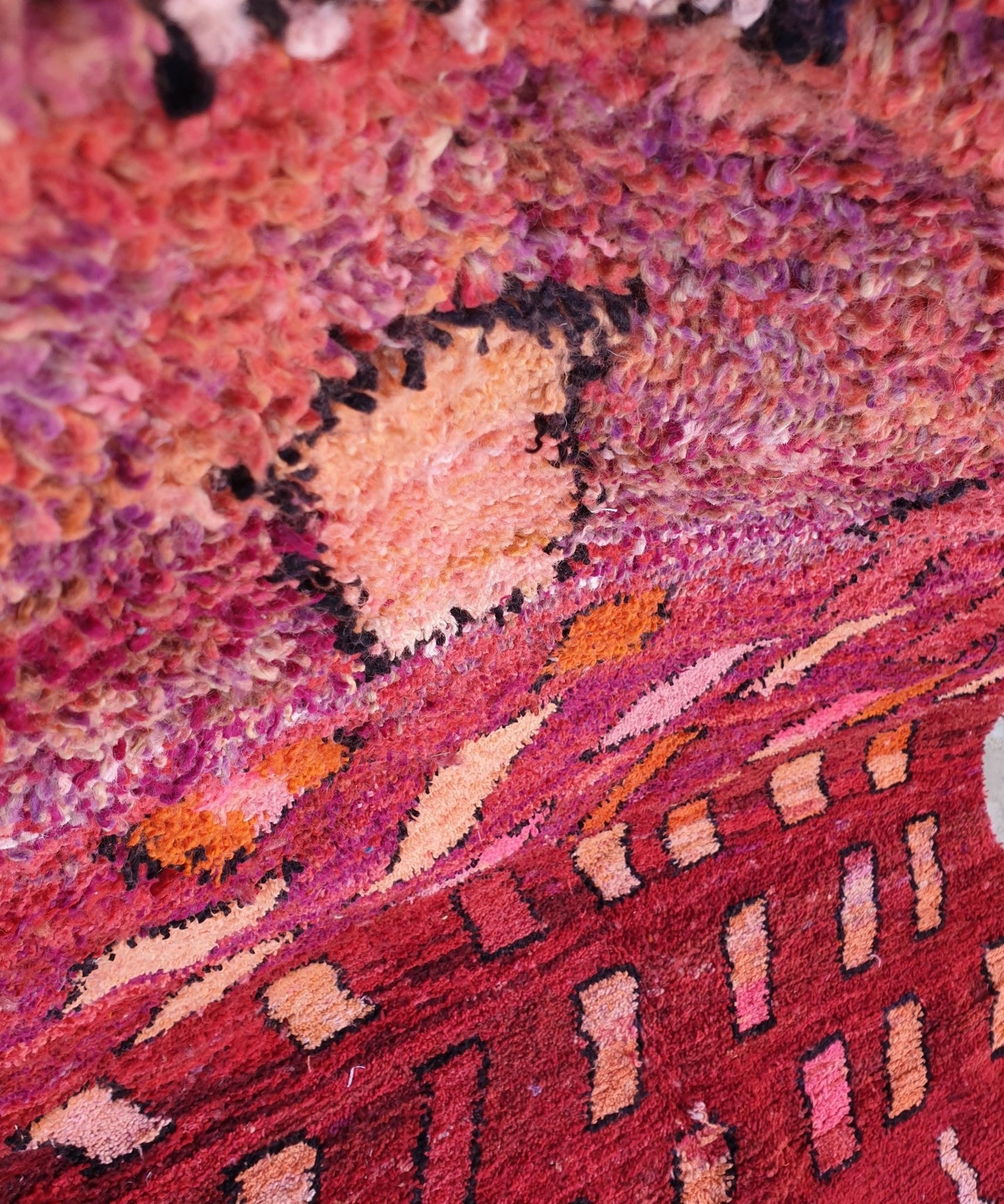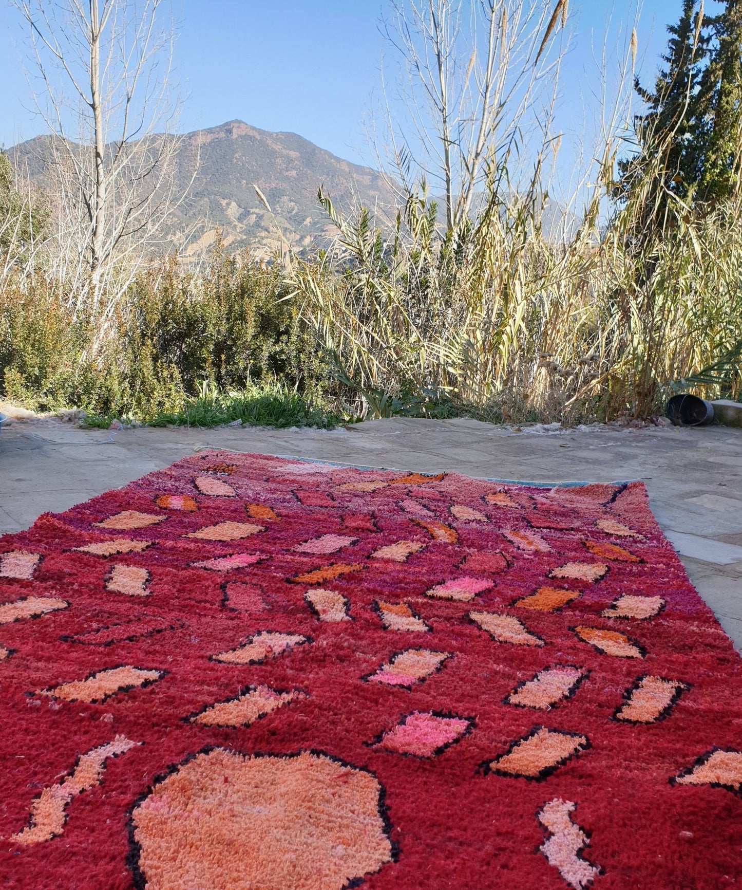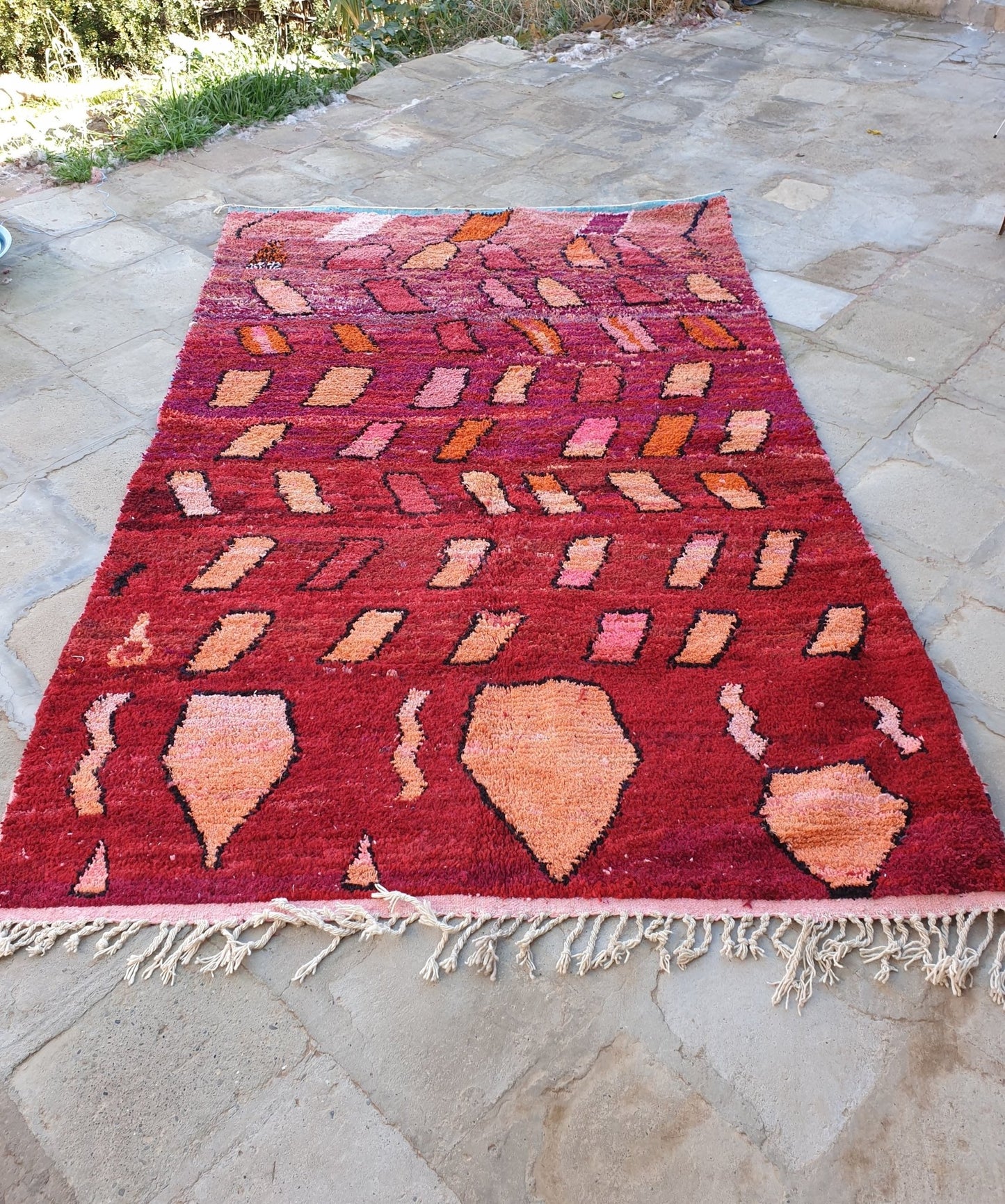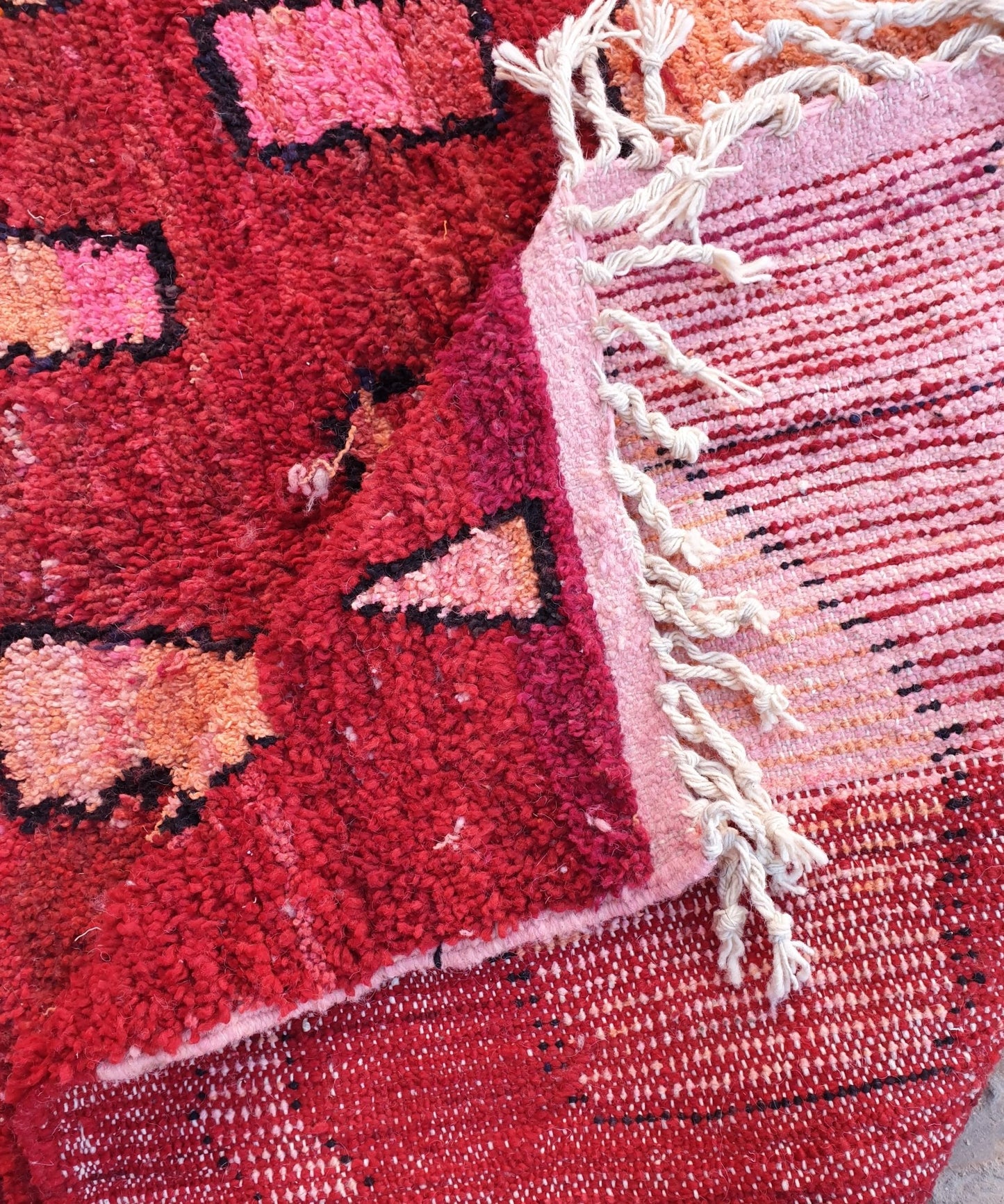 Boujaad rugs originally woven on traditional looms by Berber women in the Atlas Mountains of Morocco. These rugs are all individually handcrafted, each rug is special, unique and different, and you can never find the same pattern. They are made from natural sheep wool with natural dye, and typical knotting techniques practiced by Berber tribes - but with the knot being pulled tighter, those rugs require less wool which allows the weaver to create the intricate geometric patterns things that make Boujaad rugs famous and desired by the whole word and perfect for any indoor or outdoor style.