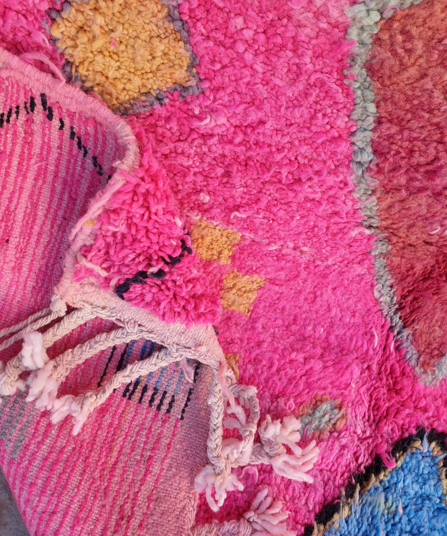 Boujaad rugs originally woven on traditional looms by Berber women in the Atlas Mountains of Morocco. These rugs are all individually handcrafted, each rug is special, unique and different, and you can never find the same pattern. They are made from natural sheep wool with natural dye, and typical knotting techniques practiced by Berber tribes - but with the knot being pulled tighter, those rugs require less wool which allows the weaver to create the intricate geometric patterns things that make Boujaad rugs famous and desired by the whole word and perfect for any indoor or outdoor style.