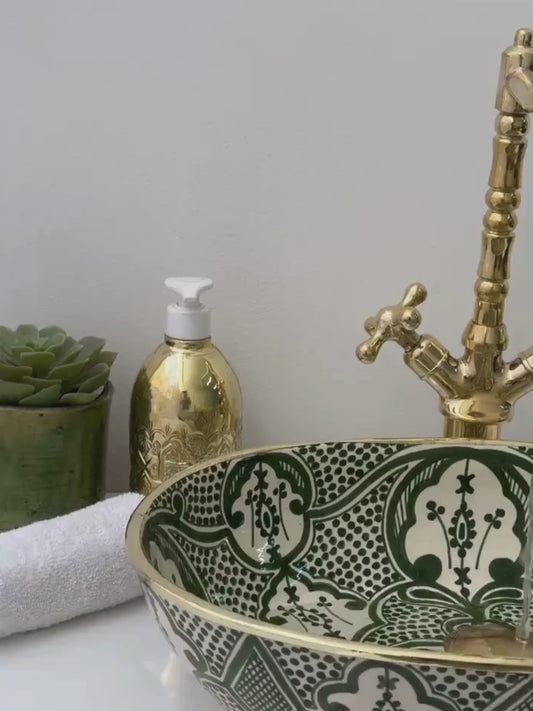 Handcrafted by artisans in Fez, this round sink bowl showcases traditional zellige-inspired patterns in a stunning green hue. Molded on a spinning wheel, sun-dried, and kiln-fired, each handmade ceramic sink reflects centuries-old techniques, making it a unique artisan bathroom sink. The natural variations in texture and colour add to its charm, perfect for a boho bathroom sink aesthetic.