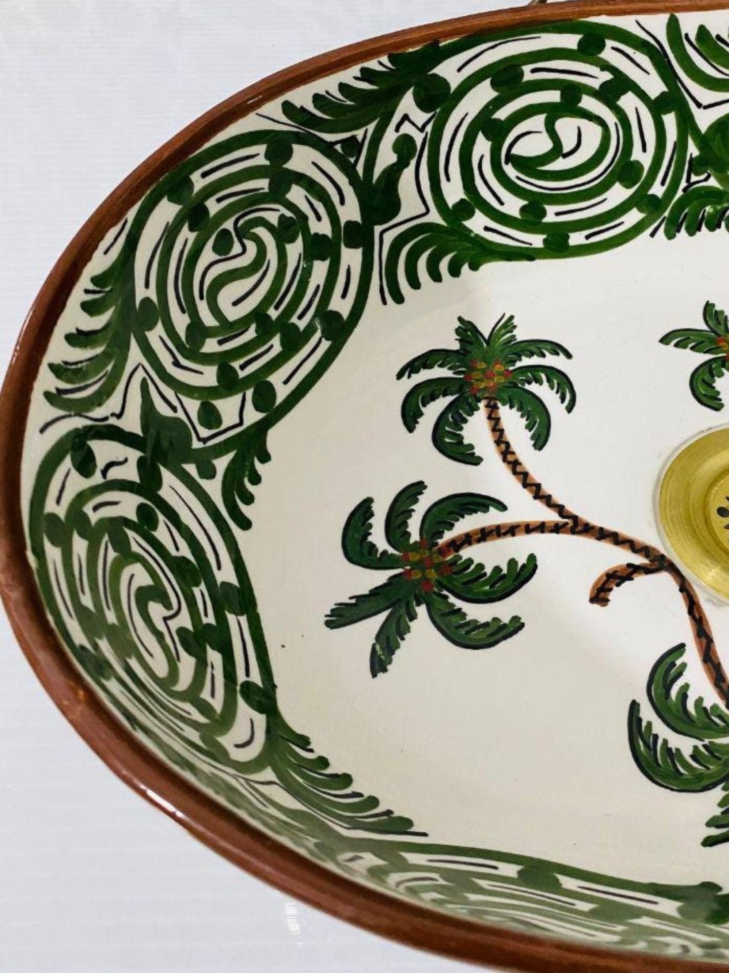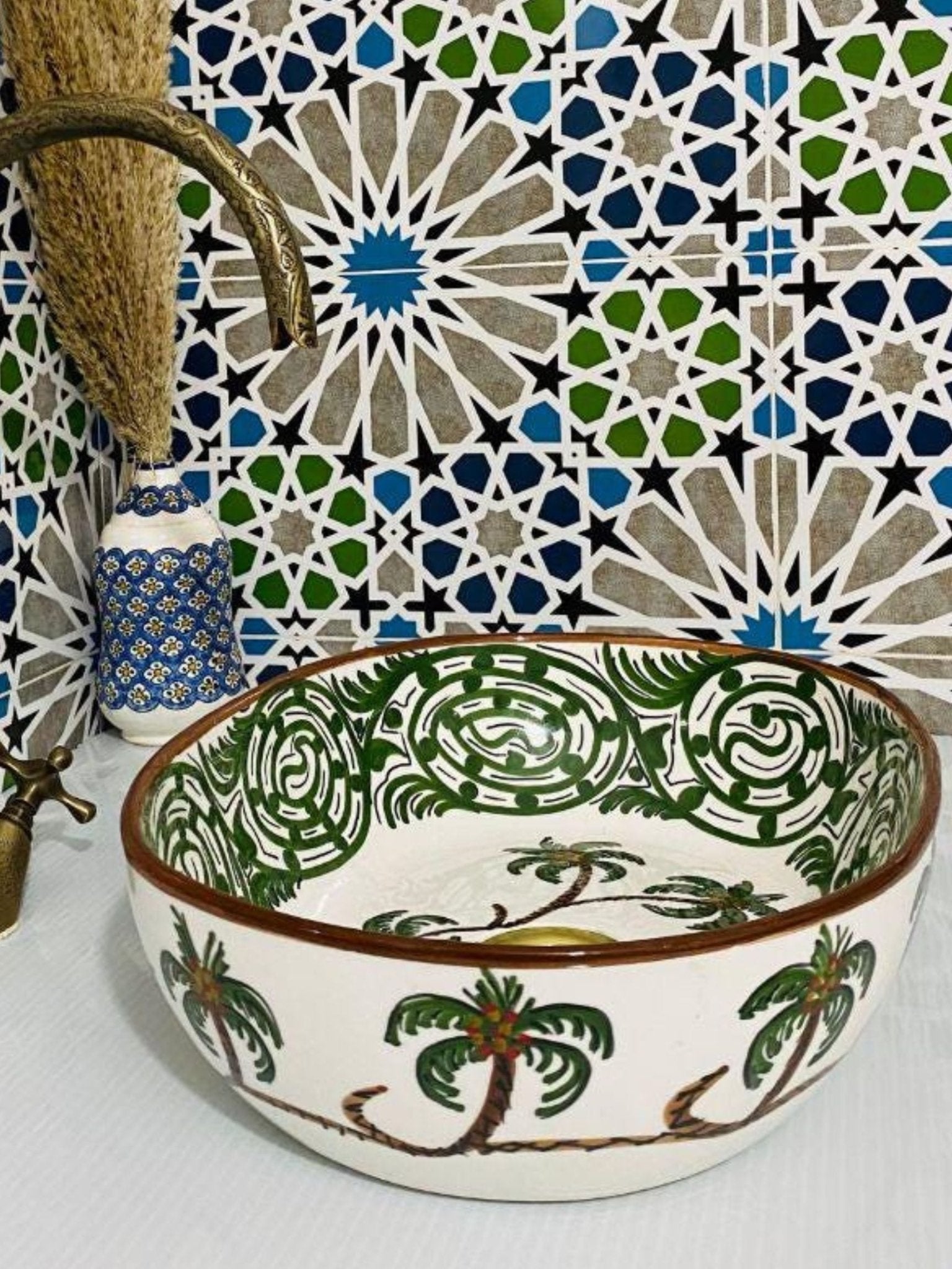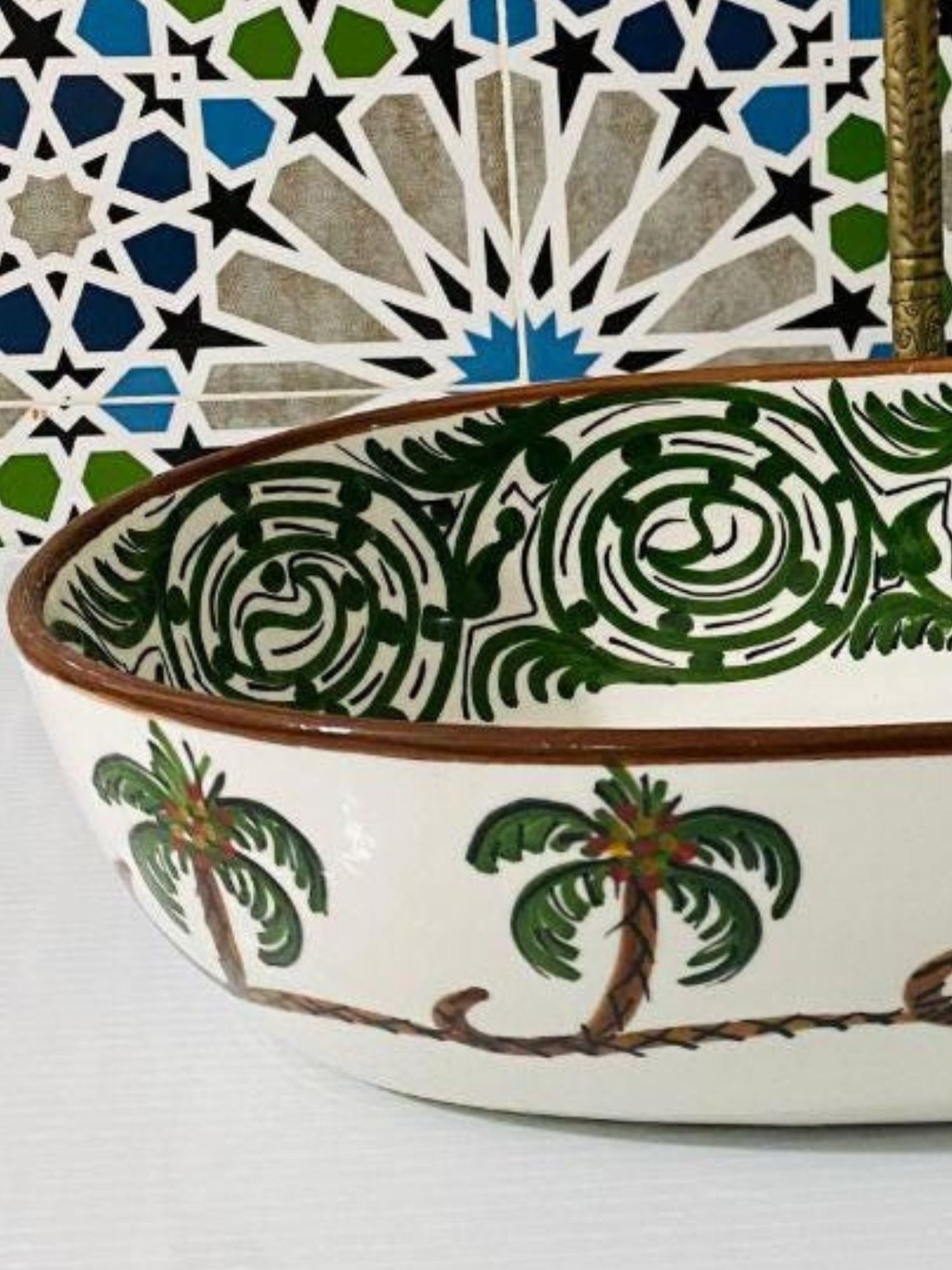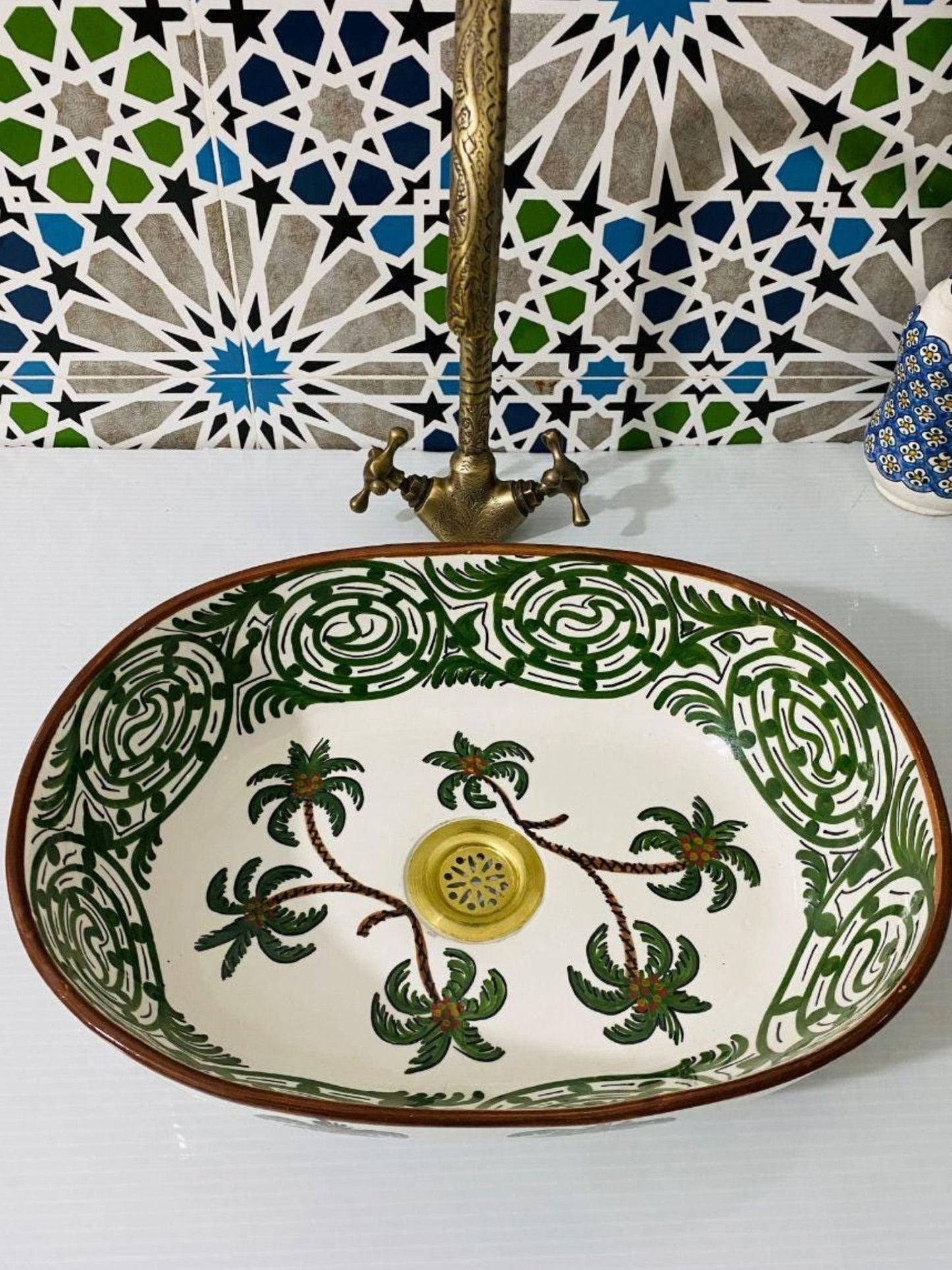 Palma - Handmade Moroccan Oval Ceramic Sink – Green Palm Wood Top Counter Vessel Sink - (ETFS)